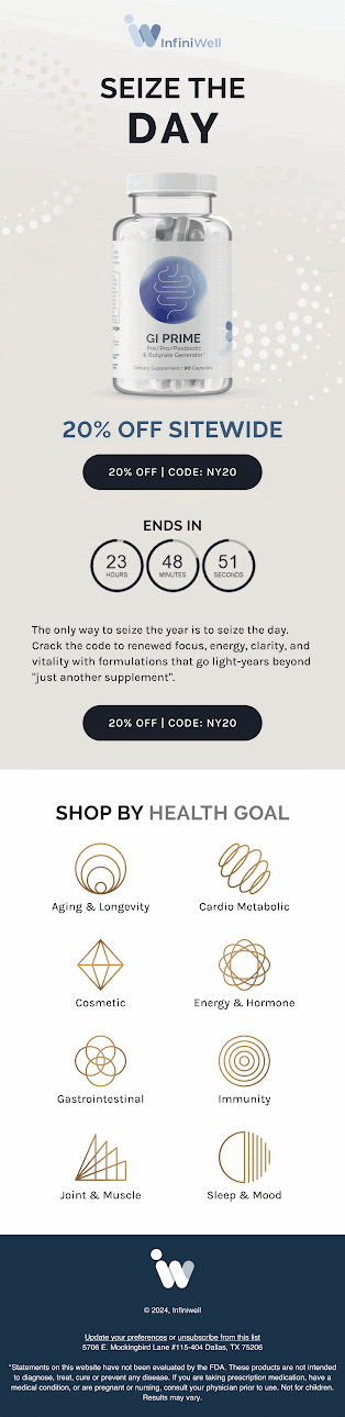 As a new and upcoming brand, Infiniwell asked us to implement email campaigns that focused on top of funnel strategy, expanding their brand awareness to engage and convert new consumers.